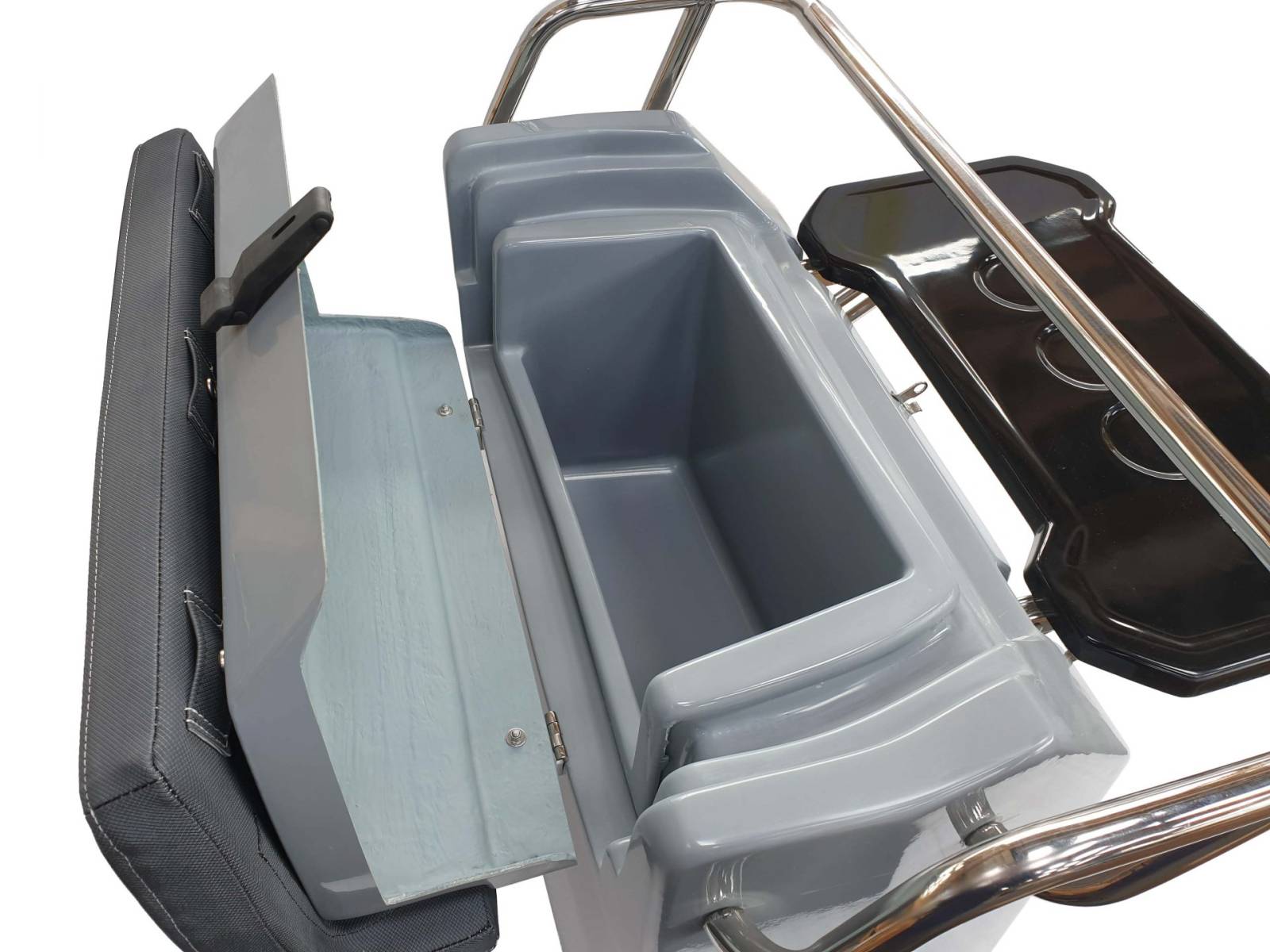 De série, votre Patrol 560 est équipé d'une console Patrol L (C04) avec coffre de rangement et un siège attenant, un siège Bolster L (S01) avec coffre de rangement et table de pique-nique, et d'un réservoir en inox d'une capacité de 60 litres intégré dans le pont.