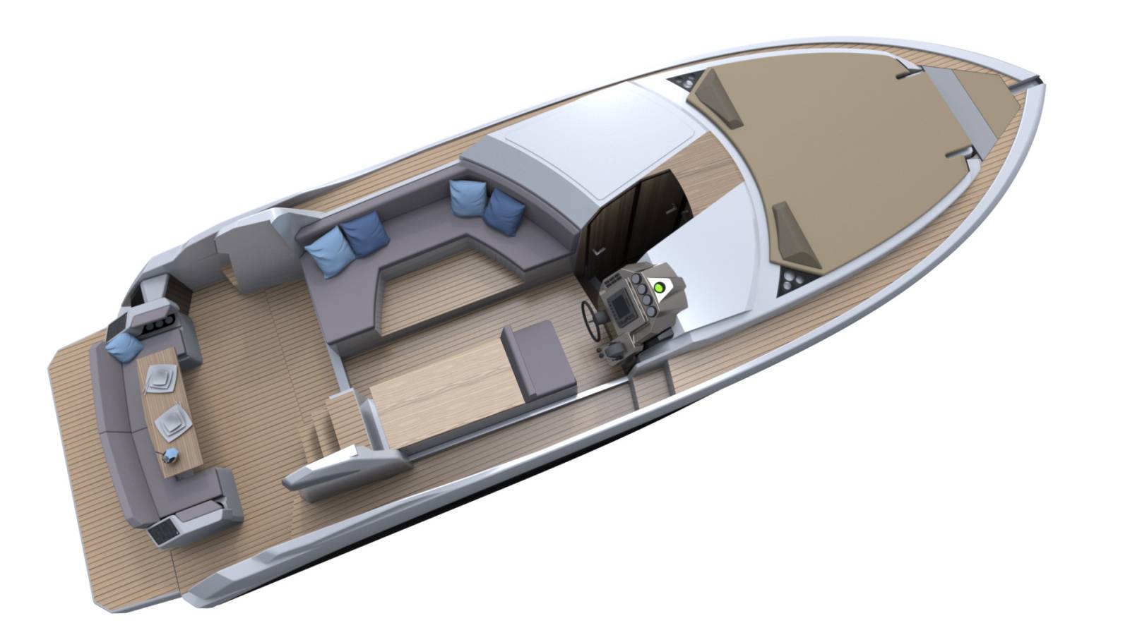 Sur le flybridge, un double siège de pilotage et un espace de détente accueillent les passagers, tandis que les plus aventuriers profiteront des bains de soleil à l'avant ou du siège avant innovant pour une expérience unique. À l’intérieur, un vaste espace salon fait face à une cuisine entièrement équipée, avec le poste de pilotage avancé. Le capitaine bénéficie d’une porte coulissante à tribord, facilitant l’accès au pont avant lors des manœuvres d’amarrage.