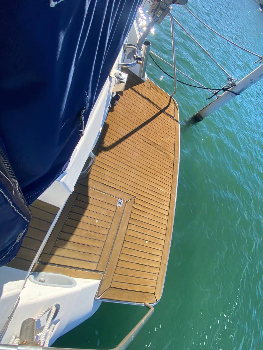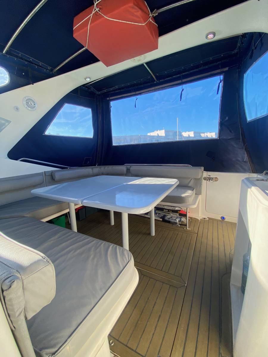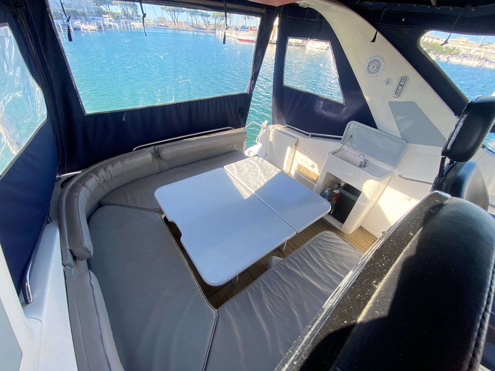 Bateau toujours protégé par ses tauds, selleries rangées après chaque utilisation, bain de soleil avant inclus.