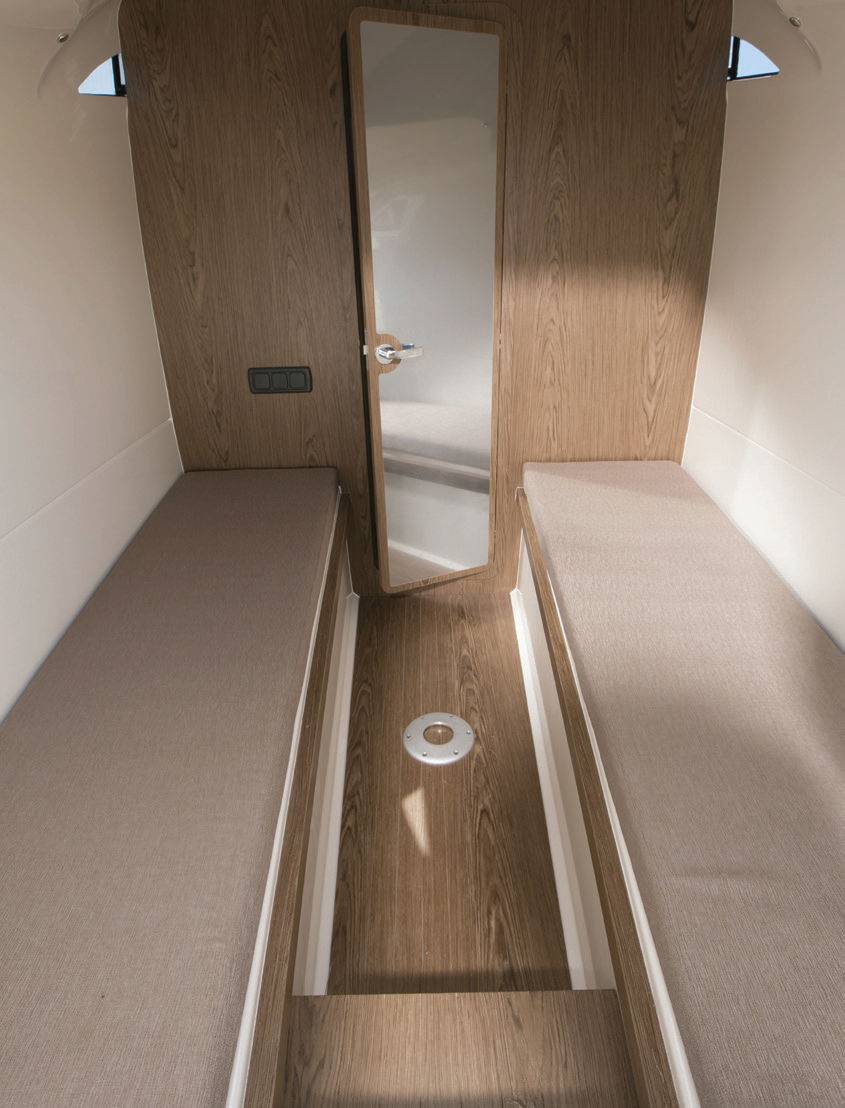 Son équipement de série comprend tout le nécessaire pour une navigation confortable et élégante, notamment des revêtements en teck raffinés et un aménagement de la cabine avant avec WC marin. Pour ceux qui souhaitent un maximum de personnalisation, de nombreuses options exclusives sont également disponibles.