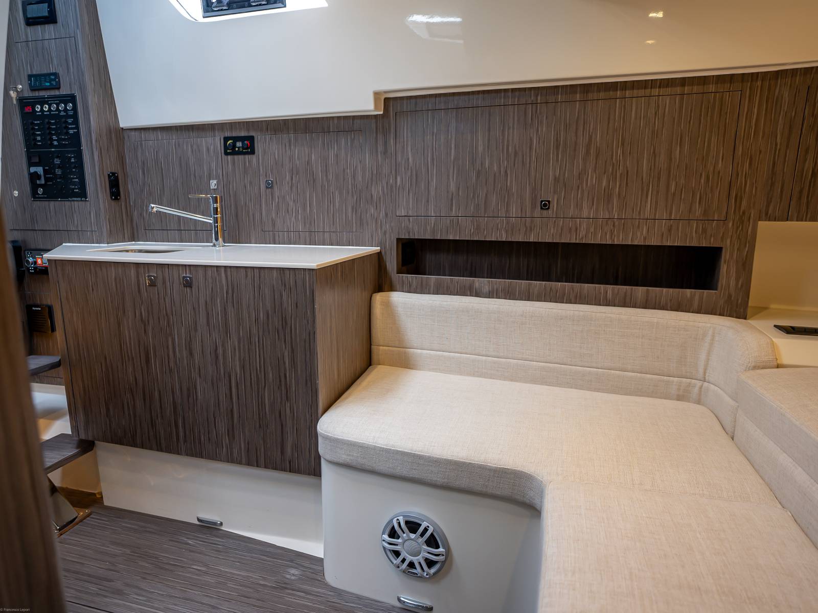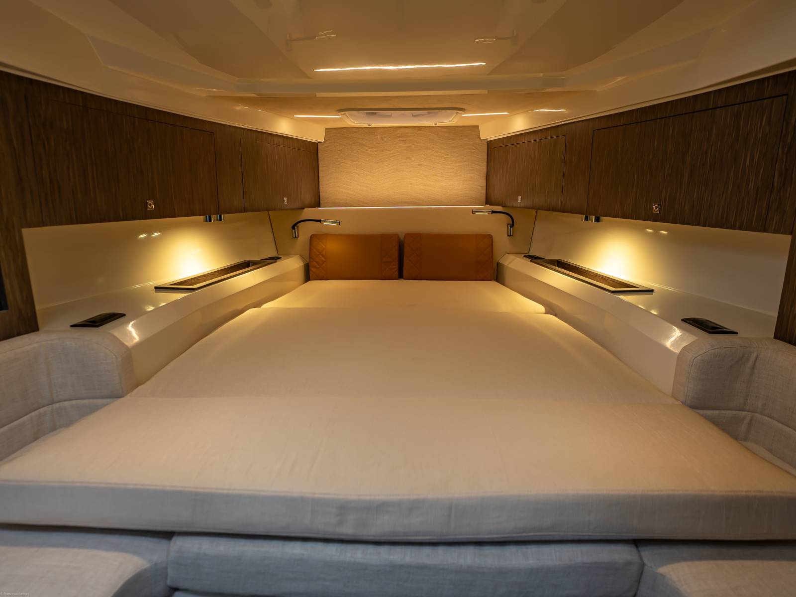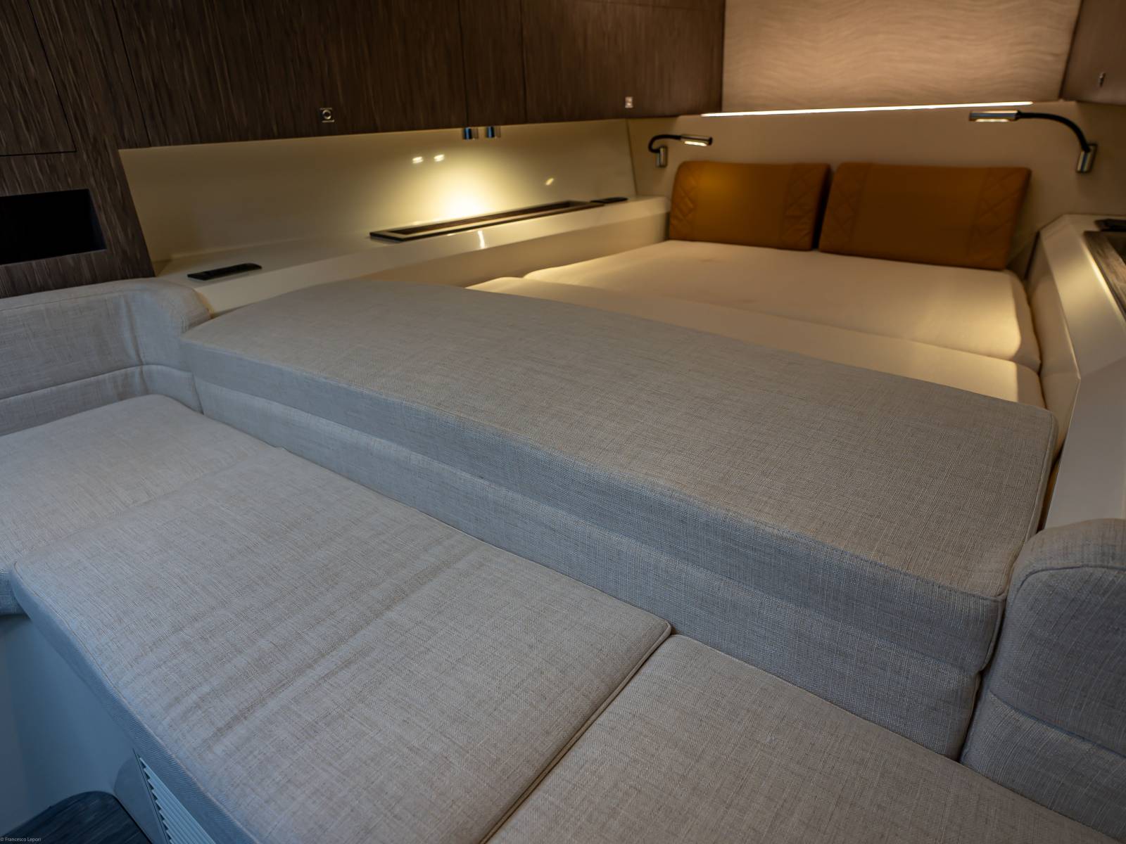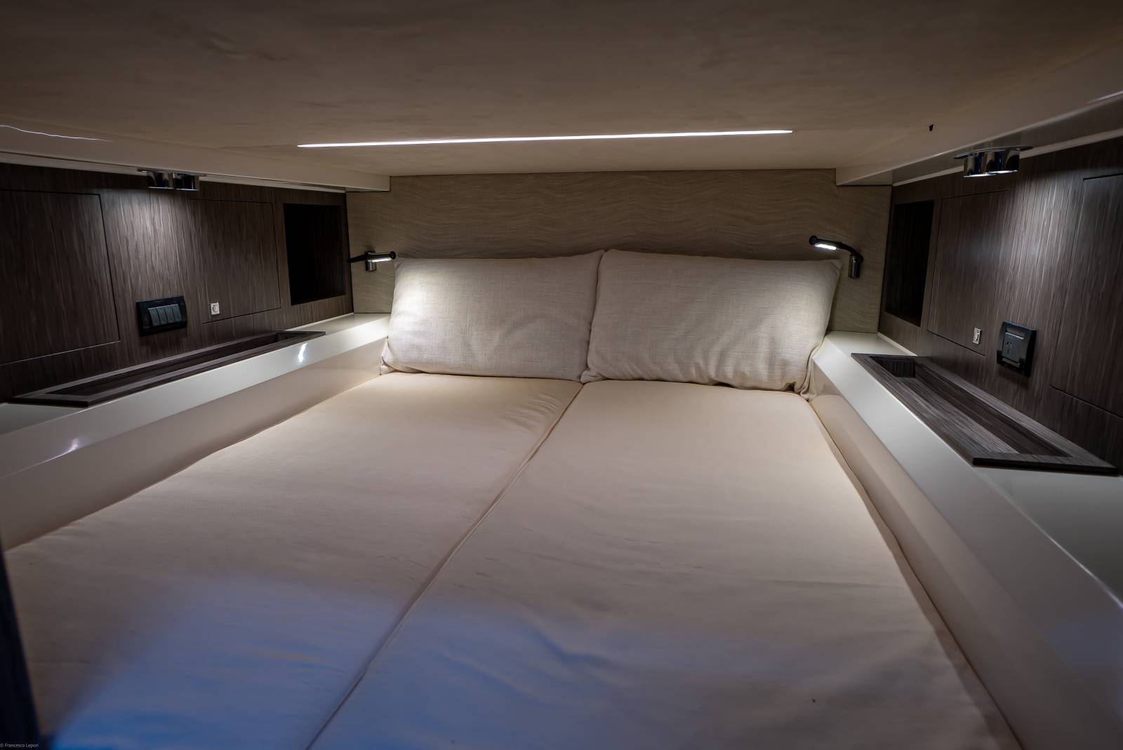 L'intérieur, marqué par un design raffiné et des matériaux « Made in Italy », allie élégance et modernité. La cabine principale dispose d’un vaste lit double avec des fenêtres panoramiques intégrées à la carène, offrant une vue imprenable sur l’horizon.
