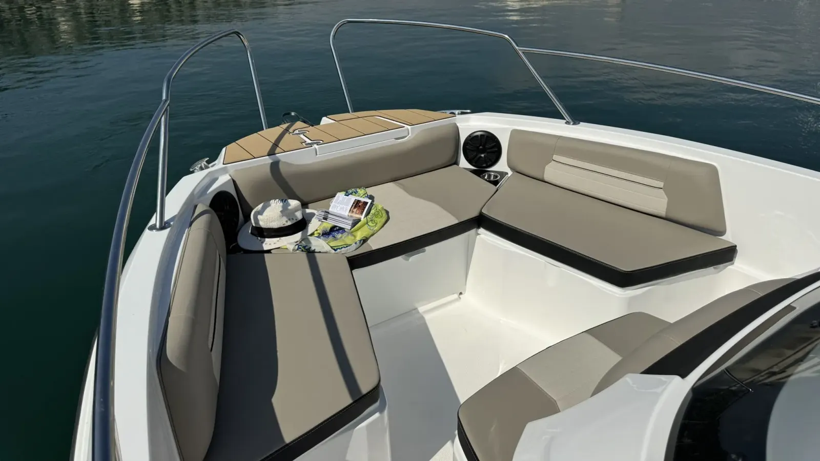 Son cockpit arrière transformable, son wet bar équipé (évier, glacière) et sa cabine de rangement créent un environnement convivial, fonctionnel et luxueux à la fois. Les finitions inox, les selleries marines haut de gamme et la construction en composite injecté témoignent du soin apporté à chaque détail.