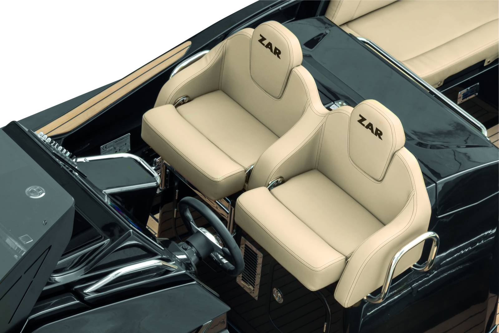 Le ZAR 95 SL se distingue par une conception pensée pour le confort à bord, le style et la performance. À l’avant, une vaste dinette accueille jusqu’à 8 personnes autour d’une table, transformable en un immense bain de soleil de 2,70 x 1,80 m. Juste devant la console, un coussin type chaise longue avec dossier double réglable permet de s’installer aussi bien en position assise qu’allongée.